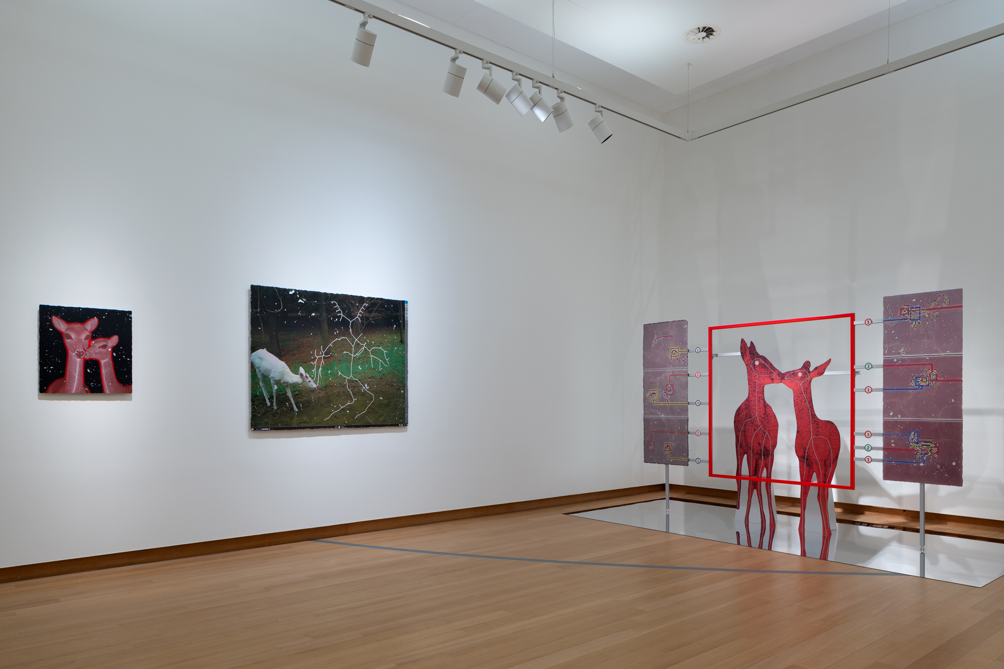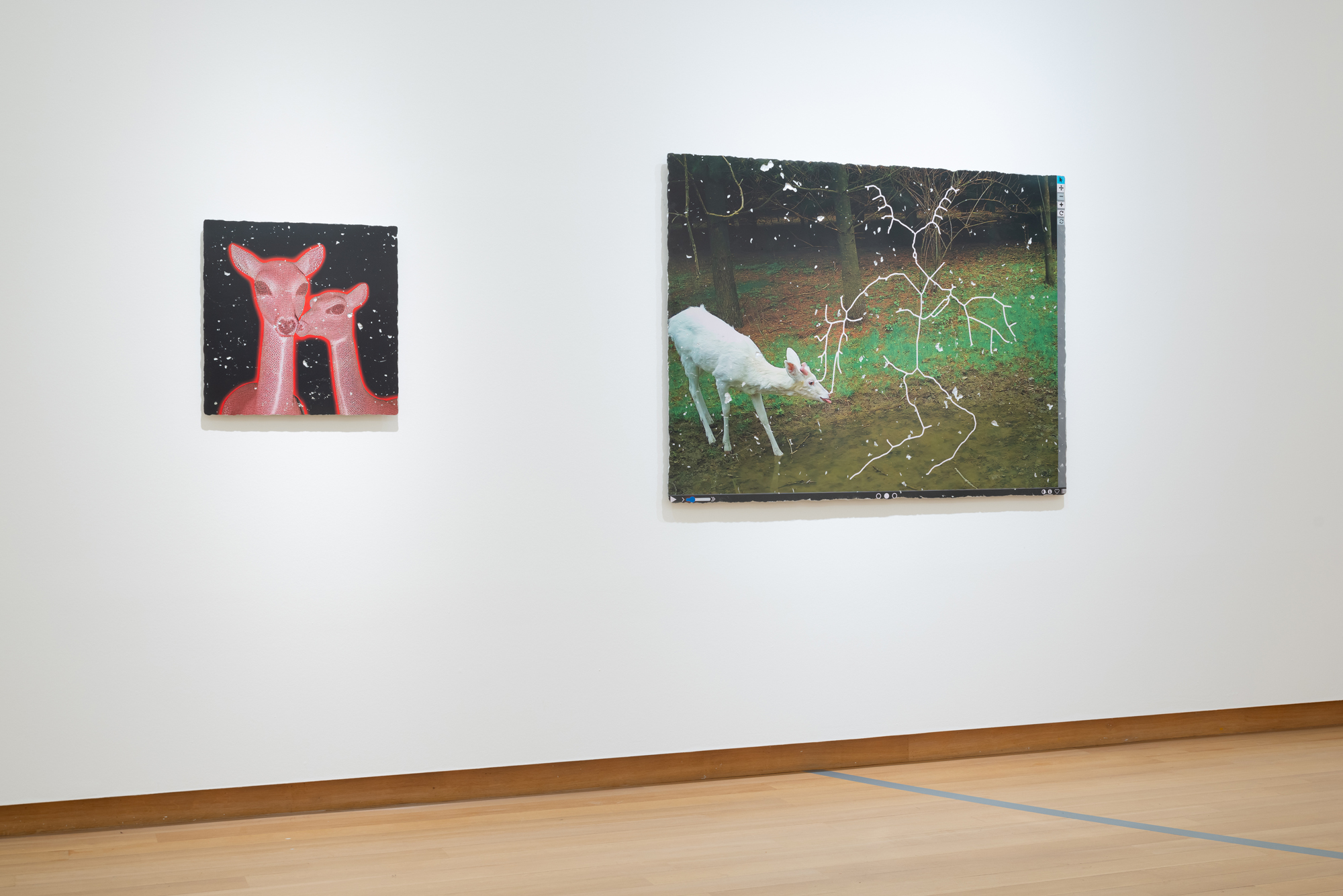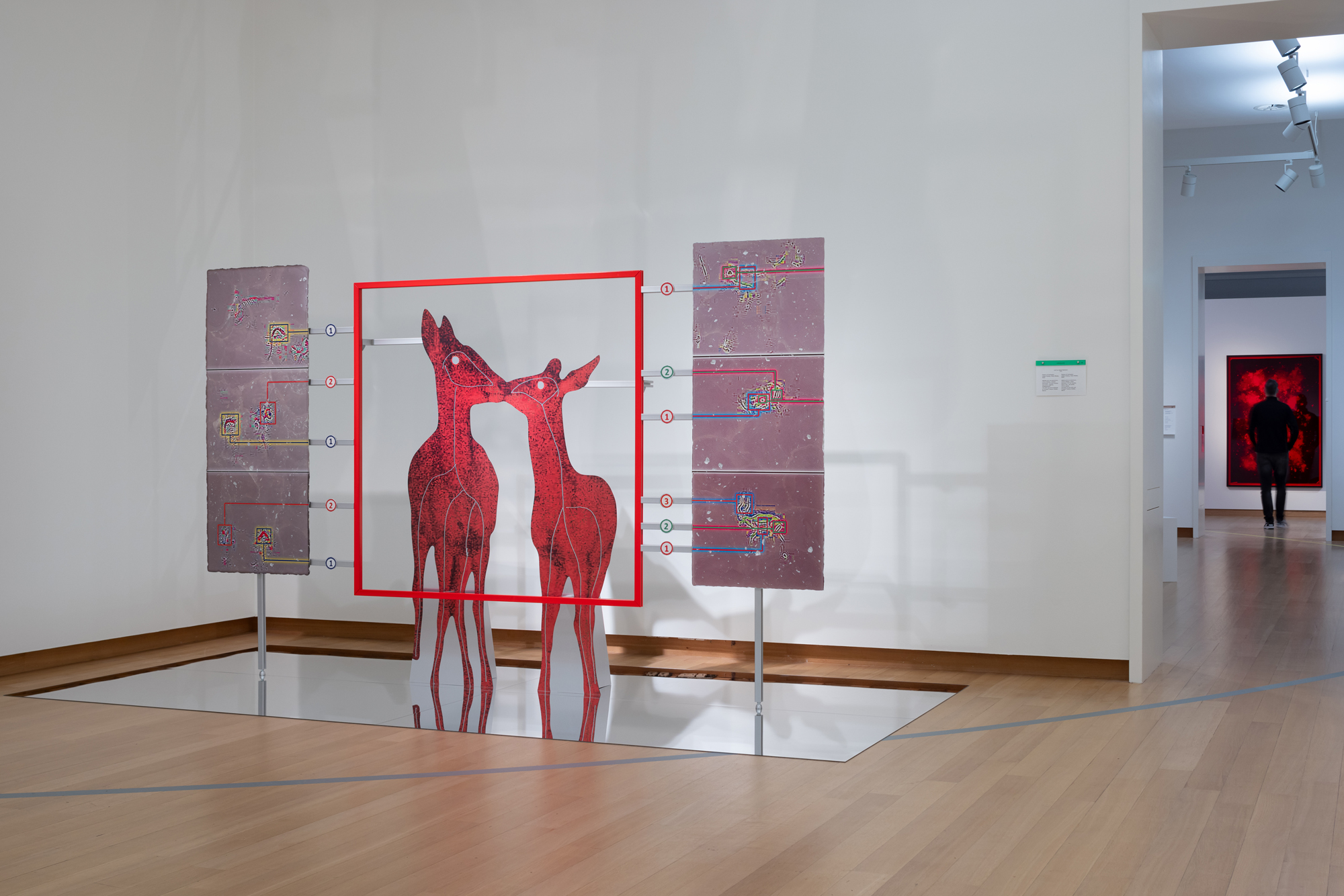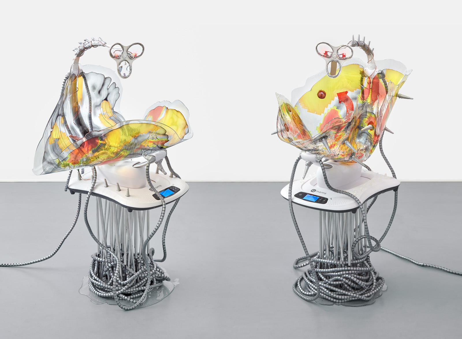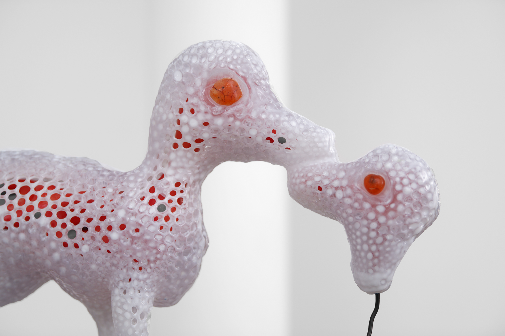 Katja Novitskova’s key themes delve into internet art practices, new technologies and ecologies of the Anthropocene era. By dealing with the complexity and the potential defectiveness within the representation of the world through technological narratives, she draws attention to the mediation tools. Novitskova creates alternative geographies of biological organisms that emerge from data sets using various devices of vision like microscopes, cameras and visual algorithms. Images researched online are often transformed into sculpture by digitally printing the material onto aluminium display stands. The site-specific installation “'Pattern of Activation (C. elegans)” is based on the work series “Approximation” (2012 – ongoing) and 'Pattern of Activation (embryogenesis)” (2017). It examines one of the most commonly used model organism species, the C. Elegans round worm, through its mediated and mutated representations in bio-medical experimental research. C. Elegans is the first animal to have its genome fully sequenced and the first animal to get an AI digital simulation of itself. It is used by Novitskova to question the exploitation of animals for biomedical purposes, as well as the future of genetic modification. Scaled up to the size of giant snake-like forms, these worm shapes wriggle weightlessly into the air with cables are slipping out of their eggs creating immersive, post human landscapes that have overcome the biotic apocalypse. As if bio-technological mutants and artificial intelligence have replaced all wild life. This eerie landscape reflects the potential ecological effects of increasing human tinkering with life forms on the level of genomes and body structures, which can be seen as a new form of colonial expansion.