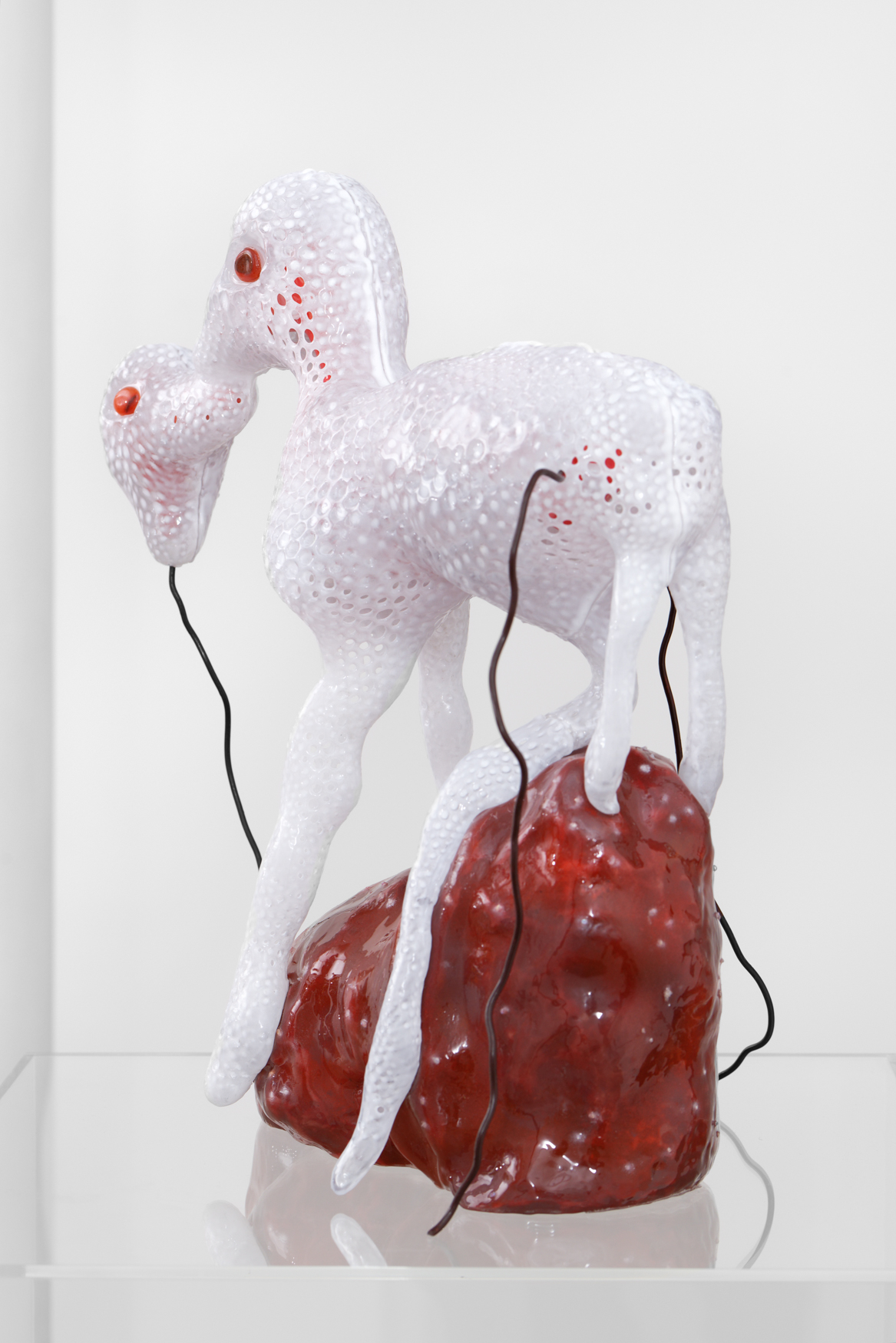 The surrender to artificial intelligence is found at the core of Katja Novitskova’s creative process. Part of a series titled Soft Approximations, a sculpture is rendered using the Midjourney algorithm blending two images, documentation photos of older works, bringing light to how the mutation and cross-breeding the artist has once authored generates potential new forms that she herself could have never imagined. A second sculpture is created using DALL-E, elaborating on one scientific image that tried to approximate how a dolphin would identify a human being using echolocation: a non-human AI algorithm approximating how a non-animal dolphin would see a person.