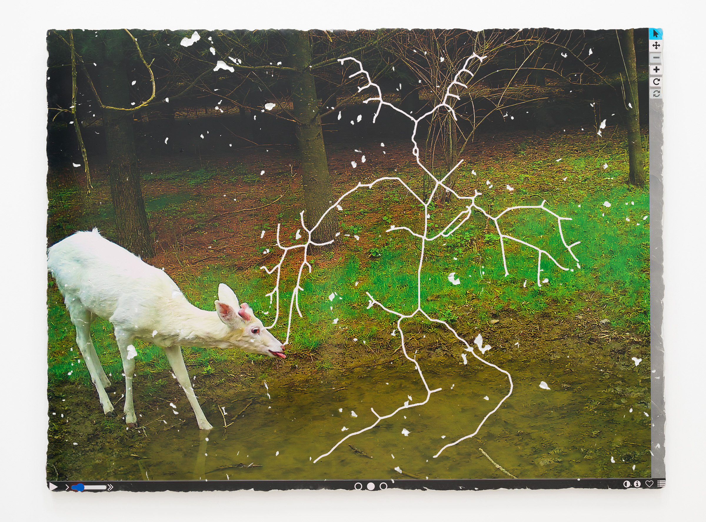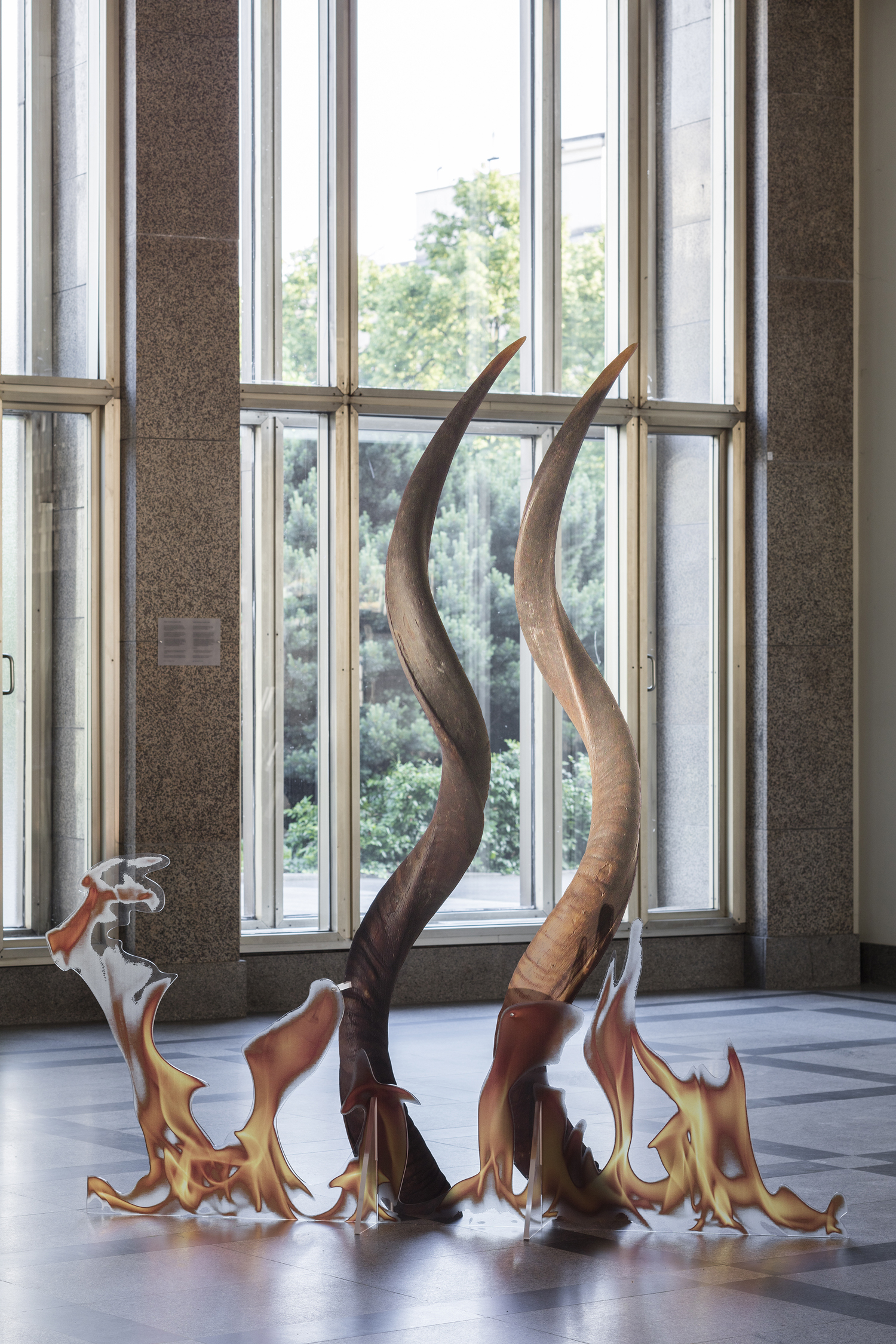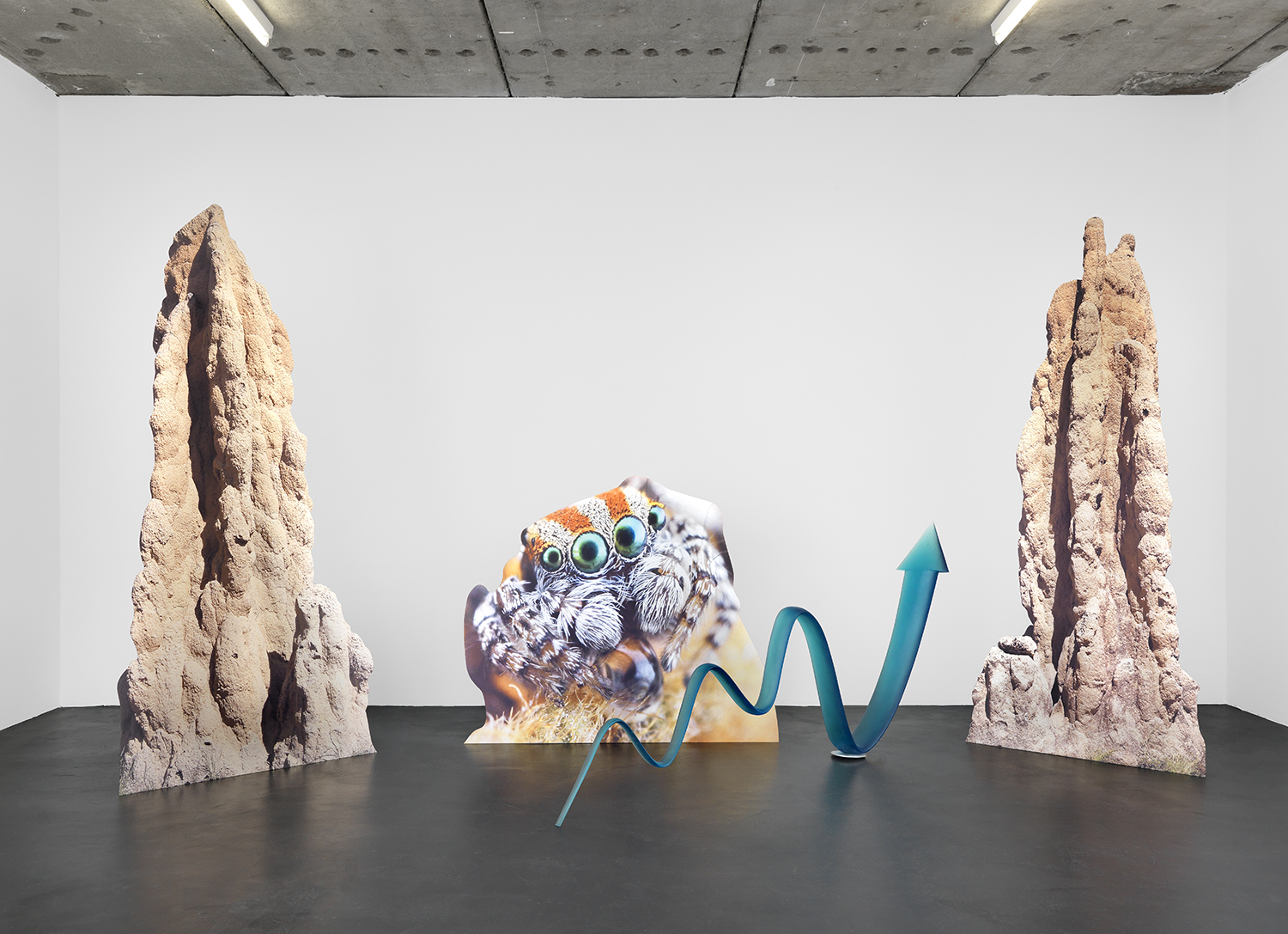 Katja Novitskova’s key themes delve into internet art practices, new technologies and ecologies of the Anthropocene era. By dealing with the complexity and the potential defectiveness within the representation of the world through technological narratives, she draws attention to the mediation tools. Novitskova creates alternative geographies of biological organisms that emerge from data sets using various devices of vision like microscopes, cameras and visual algorithms. Images researched online are often transformed into sculpture by digitally printing the material onto aluminium display stands. The site-specific installation “'Pattern of Activation (C. elegans)” is based on the work series “Approximation” (2012 – ongoing) and 'Pattern of Activation (embryogenesis)” (2017). It examines one of the most commonly used model organism species, the C. Elegans round worm, through its mediated and mutated representations in bio-medical experimental research. C. Elegans is the first animal to have its genome fully sequenced and the first animal to get an AI digital simulation of itself. It is used by Novitskova to question the exploitation of animals for biomedical purposes, as well as the future of genetic modification. Scaled up to the size of giant snake-like forms, these worm shapes wriggle weightlessly into the air with cables are slipping out of their eggs creating immersive, post human landscapes that have overcome the biotic apocalypse. As if bio-technological mutants and artificial intelligence have replaced all wild life. This eerie landscape reflects the potential ecological effects of increasing human tinkering with life forms on the level of genomes and body structures, which can be seen as a new form of colonial expansion.